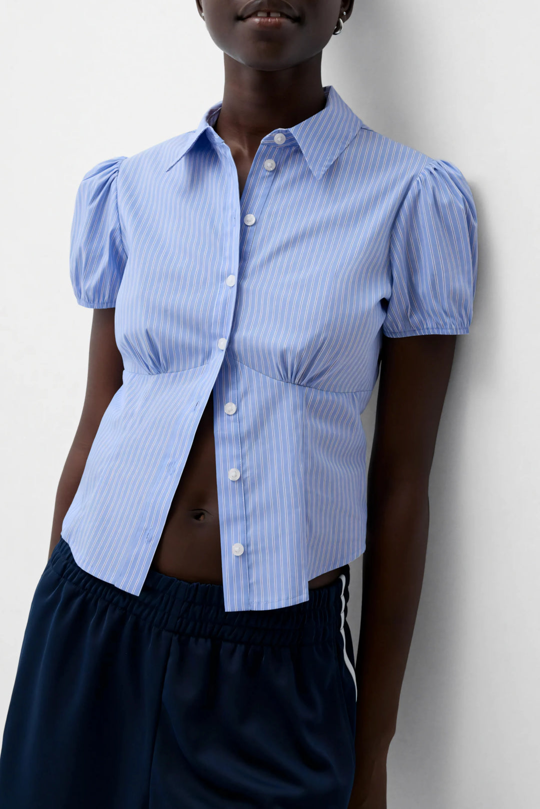 A fresh take on a classic button-up, the Short Sleeve Poplin Shirt brings effortless style with a hint of femininity. Featuring soft puff sleeves, a flattering cinched waist, and crisp stripes, it’s designed for the modern woman who loves a polished yet relaxed look.
