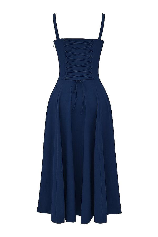 You'll feel ultra feminine in our 'Carmen' dress that's the perfect match for romantic date nights. It's cut from stretch cotton in a gorgeous navy hue and has a corseted bodice to cinch the fit with a beautiful lace up back. The gathered bust has a drawstring tie and the side split adds a little sexiness to reveal a flash of leg.