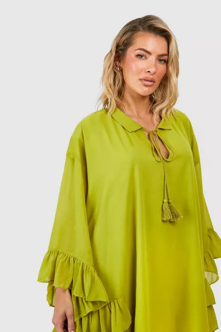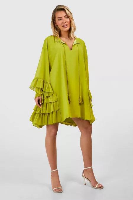 Feel like a true vision in green with this Ruffle Dress, its graceful design and delicate lace evoking feelings of romance and enchantment, perfect for creating unforgettable memories.